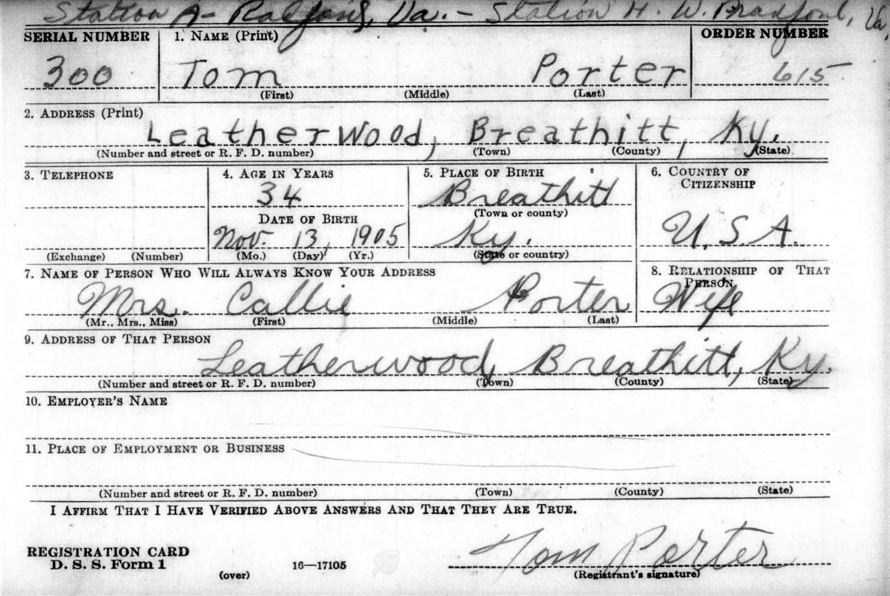 Porter was the 20-year-old son of Samuel and Polly (Campbell) Porter. He was raised by his mother and stepfather, Ashford Napier, in Perry County. Born on November 13, 1903, near the Breathitt/Perry County line at the mouth of Grapevine Creek, “Tommy” was educated at Lost Creek and was well-liked by both family and friends. He completed the eighth grade at Leatherwood School and went several days to a new high school at Riverside before leaving to work on the family farm.
