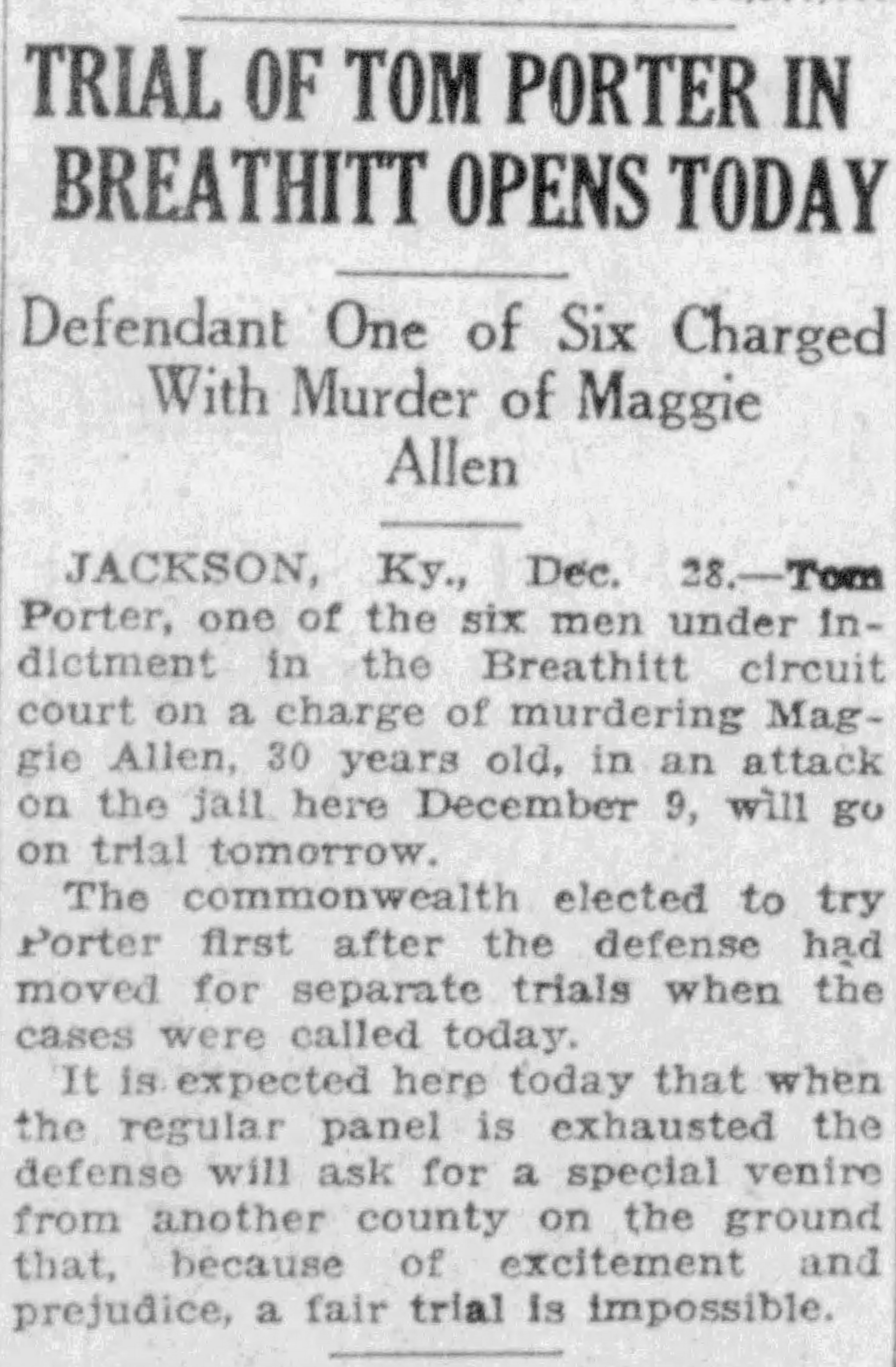 The trial of Tommy Porter started on December 29, 1921, in Breathitt Circuit Court for complicity in the murder of Albert Roberts and Maggie Allen and the wounding of Sarah Allen.