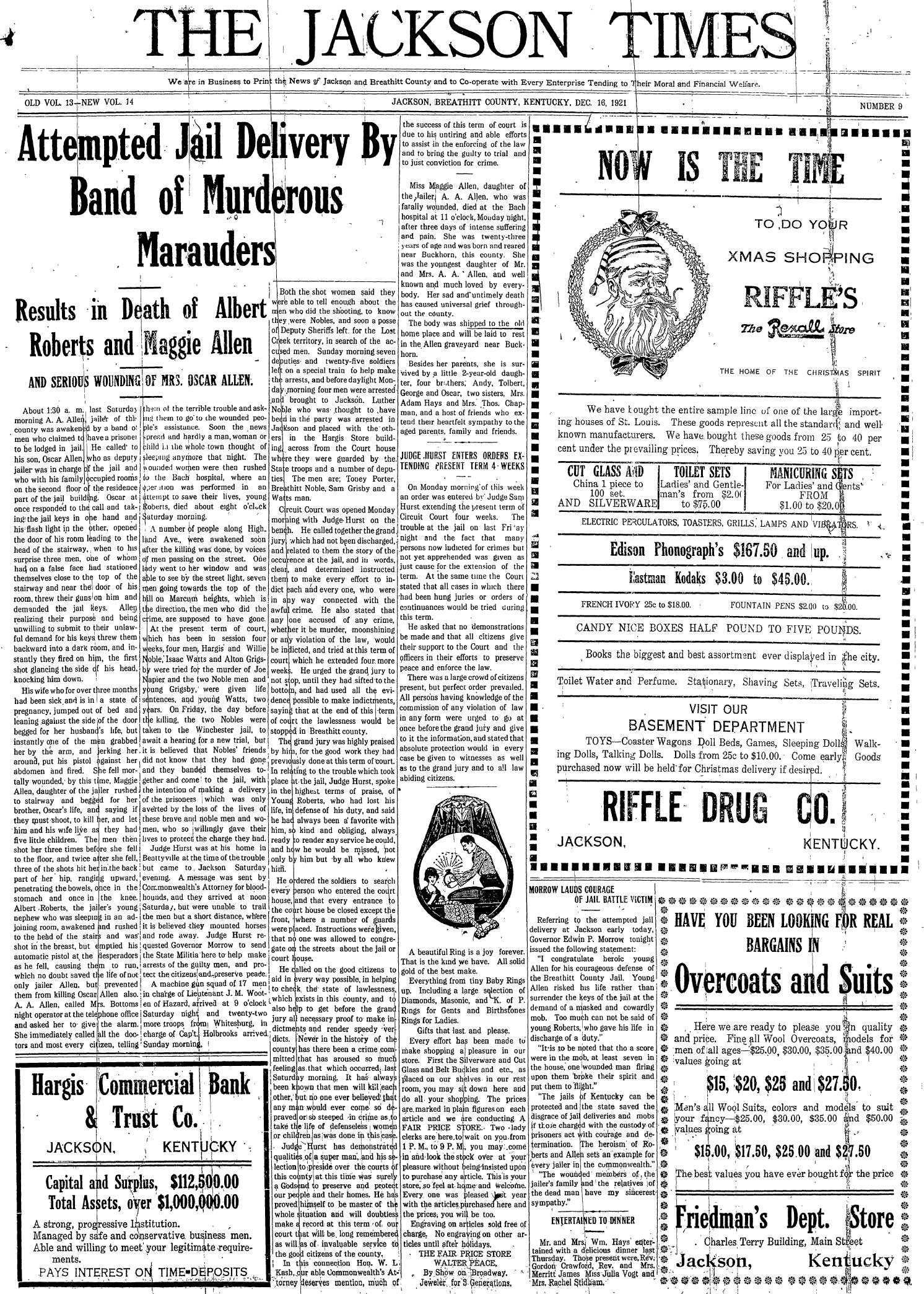 Just after 1:30 a.m. on the morning of December 10, 1921, a group of men (the number varies depending on who is speaking) knocked at the door of the Breathitt County Jail. Someone opened the door, and the group entered. The group asked for the keys to the cells, and when they were refused, someone fired. When the smoke cleared, Deputy Jailer Albert Roberts (age 17) and Margaret “Maggie” Allen (age 24) lay mortally wounded. Sarah (Hudson) Allen was severely wounded. Maggie Allen and Sarah Allen were taken to the Bach Hospital. Maggie died three days later, on December 13, 1921. Sarah Allen survived for two years, but she died from the lingering effects of her wounds on February 20, 1923.