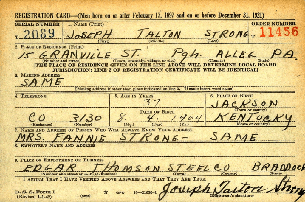 By 1940, he was renting a home on Centre Avenue in Allegheny County, Pennsylvania for $23 per month and working in a steel mill. Strong told the census taker that he worked 16 weeks in 1939 and made $360.