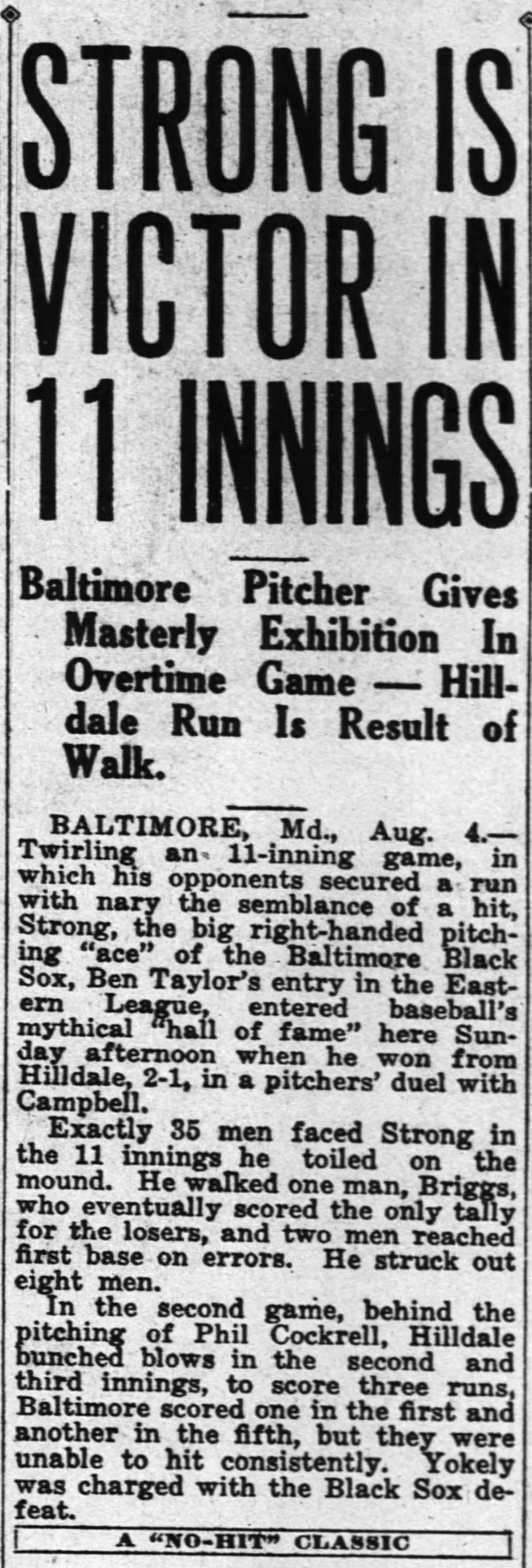 Strong dominated the game striking out five, and missed a perfect game by one walk and one hit batter. Hilldale’s only run was unearned, resulting from third-inning errors by third baseman Mack Eggleston and shortstop Scrappy Brown. Black Sox star Jud Wilson tied the score at 1-1 in the bottom of the eighth with a homer to center field. Hilldale went on to win the seven-inning nightcap by a score of 3-2 before darkness forced the cancellation.