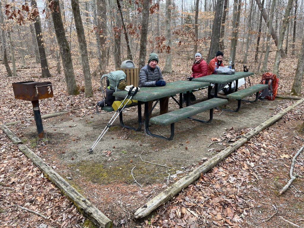 A group of us stood around the campfire and had a great time laughing and telling stories of our hiking adventures through the years. I am sure we were too loud at times and may have disturbed some of those around us but not all, as we had a steady chorus of “nose trumpets” playing all around us for much of the night. I crawled into my sleeping bag about 10:30 p.m. and had no issue sleeping, although the temperature dropped to 14 degrees and light snow fell against the tent at several points in the night.