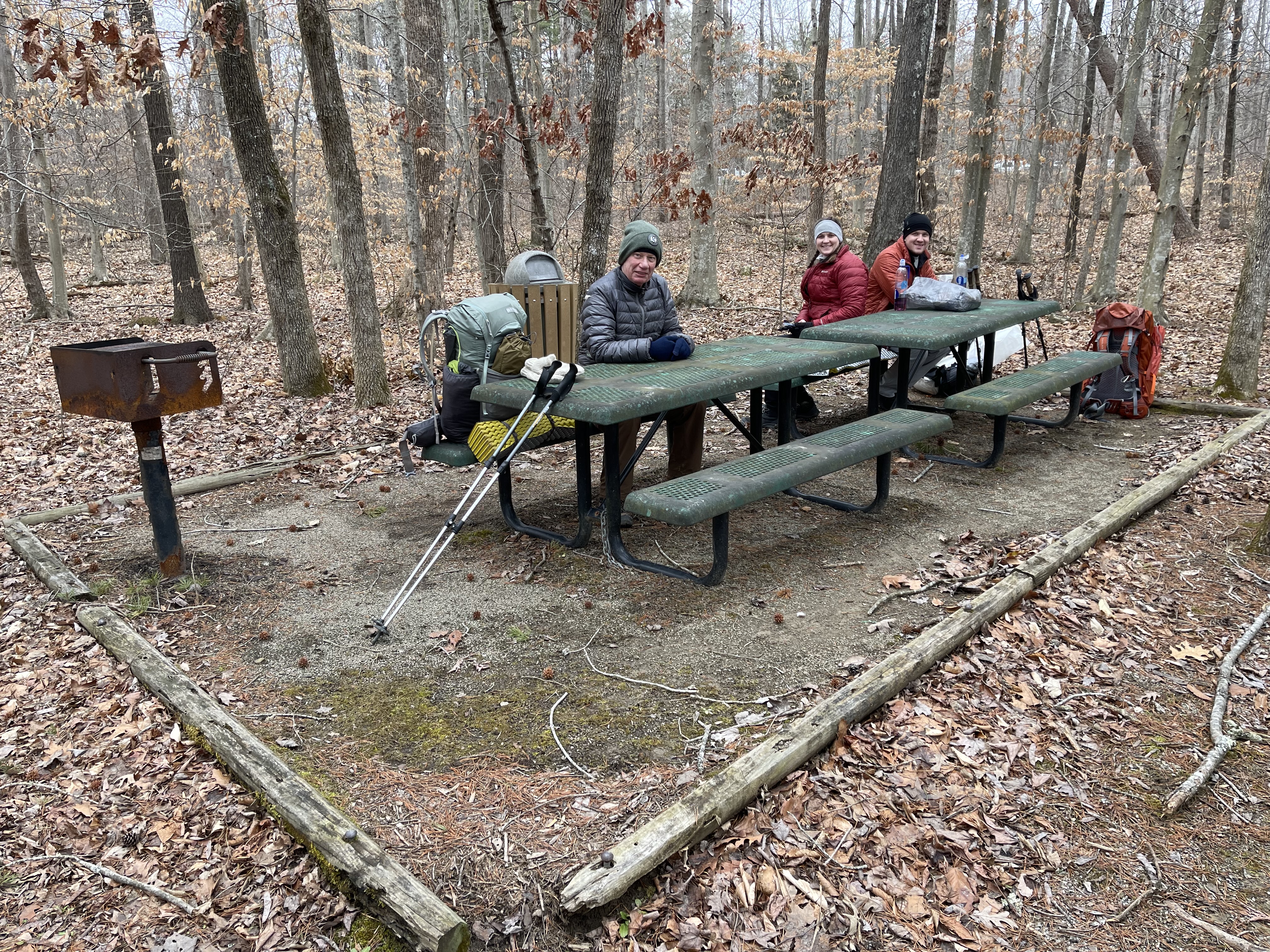 A group of us stood around the campfire and had a great time laughing and telling stories of our hiking adventures through the years. I am sure we were too loud at times and may have disturbed some of those around us but not all, as we had a steady chorus of “nose trumpets” playing all around us for much of the night. I crawled into my sleeping bag about 10:30 p.m. and had no issue sleeping, although the temperature dropped to 14 degrees and light snow fell against the tent at several points in the night.
