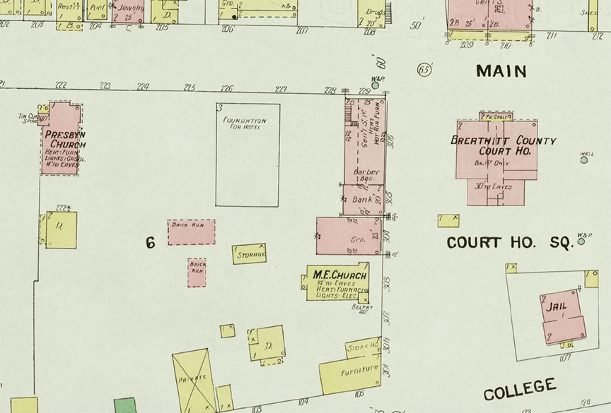 The foundation of the Hotel Jefferson sat empty and overgrown by the time the Sandborn Insurance Company made maps of Jackson in January 1908.