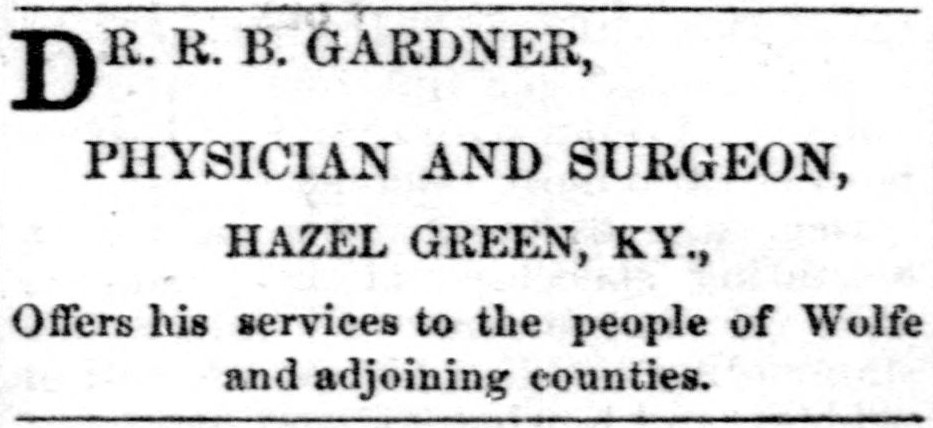 Garnder does not appear on the 1870 census. The census taker visited in 1880, and he was listed as a physician boarding with David B. James and his wife Catherine at Hazel Green in Wolfe County, Kentucky. He was a frequent advertiser in The Hazel Green Herald, offering his medical service to the “people of Wolfe and adjoining counties.”