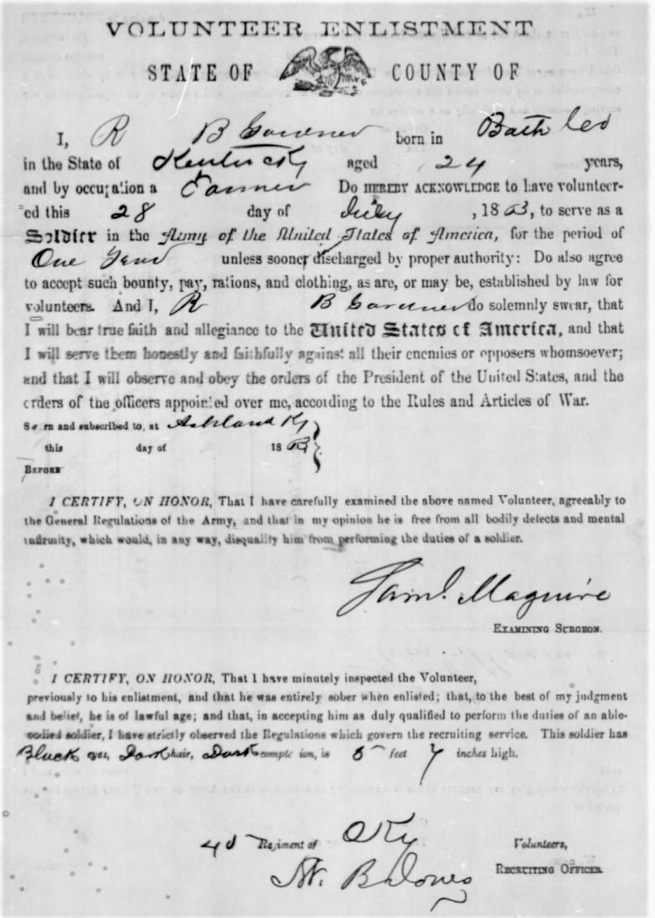 The 45th Kentucky Mounted Infantry was organized in northeastern Kentucky and was charged with patrolling the mountains from the Cumberland Gap to Louisa. Gardner and his unit participated in engagements at Salyersville, Troublesome Creek (April 27, 1864), Morganfield, Pound Gap, Mount Sterling, Cynthiana, Saltville, and many other expeditions in Kentucky and Virginia.