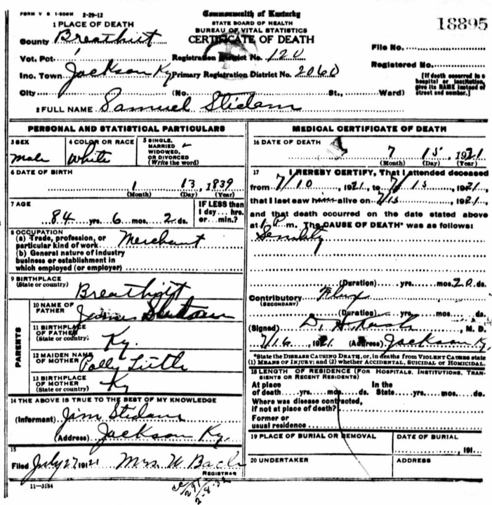 Died- July 15, 1921, at Jackson, Breathitt County, Kentucky
