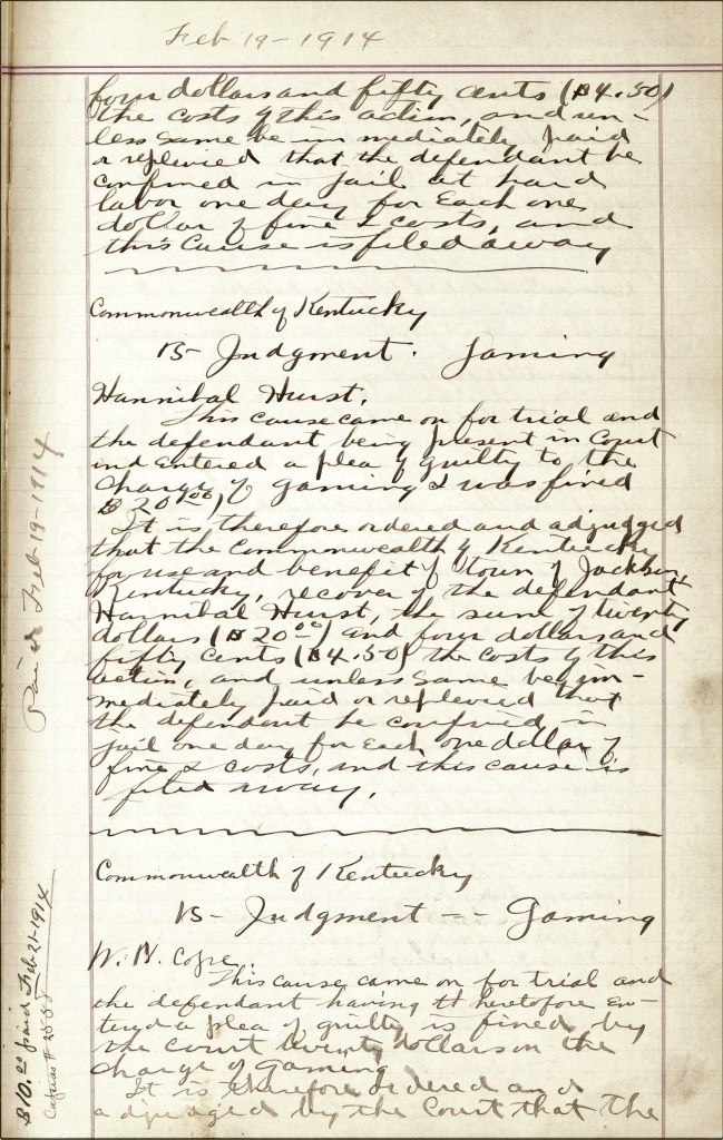 Then one afternoon, during a search for some replevin bonds in the old records, the beautiful handwriting of Judge Grannis Bach stood out in a ledger book on February 19, 1914. The cases had been hidden in another book and not recorded in the criminal proceedings where they should have been with the rest of the cases. There was no doubt- these were the fourteen gamblers mentioned in the newspaper article.