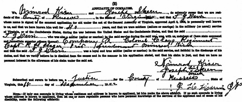 Military Service Company A, 7th Confederate Cavalry, Confederate States Army Captain R. H. Hager and Colonel Clay Highest Rank- First Lieutenant His only service records is as a pension witness on T. J. Davis, Senior's application in 1902 for a Virginia Confederate Pension. Stated that he served with J. T. Davis in Company A.