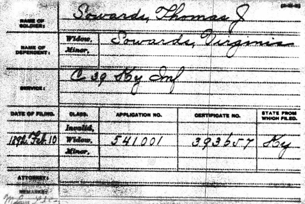 Married– to Virginia “Jane” Ratliff (1843 – after 1910) on October 25, 1858, in Pike County, Kentucky. She was the daughter of William H. and Margaret (Hatcher) Ratliff.