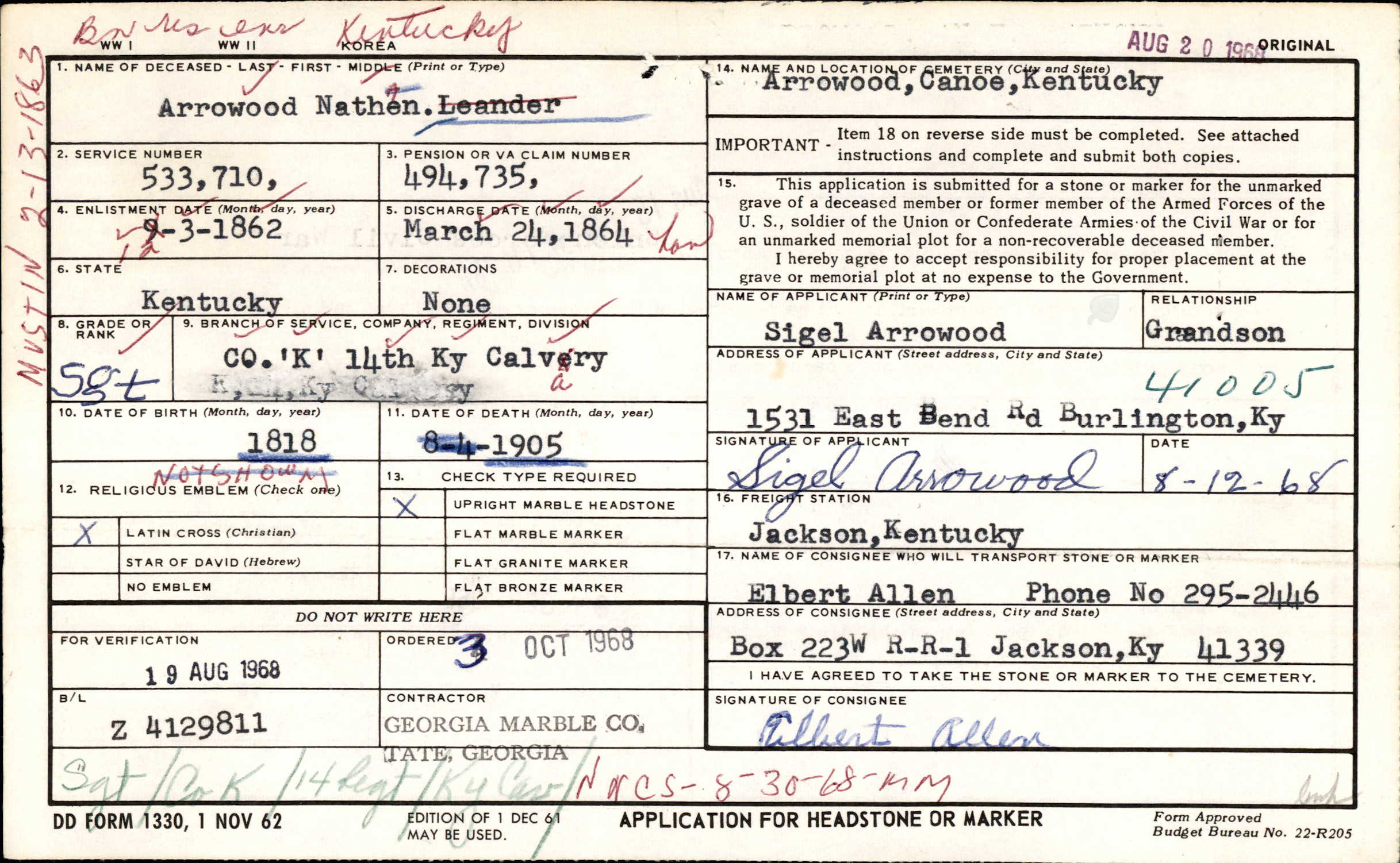 Died- October 8, 1905, on Wolfpen Branch of Canoe, Breathitt County, Kentucky. His date of death on the tombstone application listed his death as August 4, 1905.