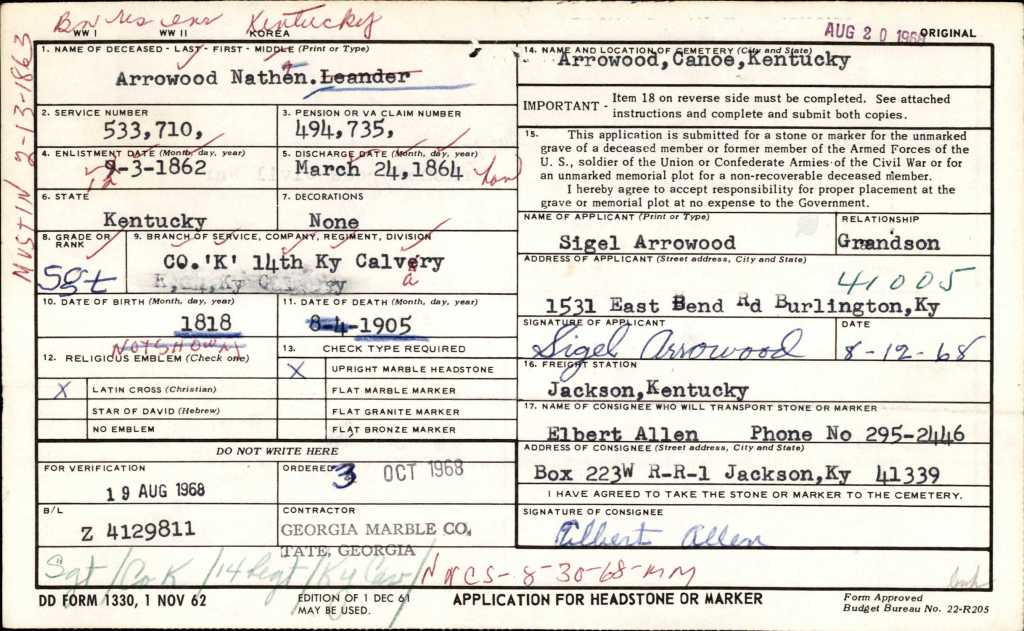 Buried- Nathan L. Arrowood Cemetery, Canoe, Breathitt County, Kentucky