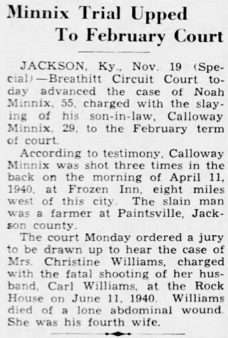 Ancil Minnix, of the Frozen Creek section, was shot through the abdomen last Thursday night near Frozen Inn, according to reports brought to Jackson. Merrill Taulbee surrendered to Chief of Police A. S. Sizemore following the shooting but was later released. Minnix was brought to the Bach hospital where his condition is reported as fair.