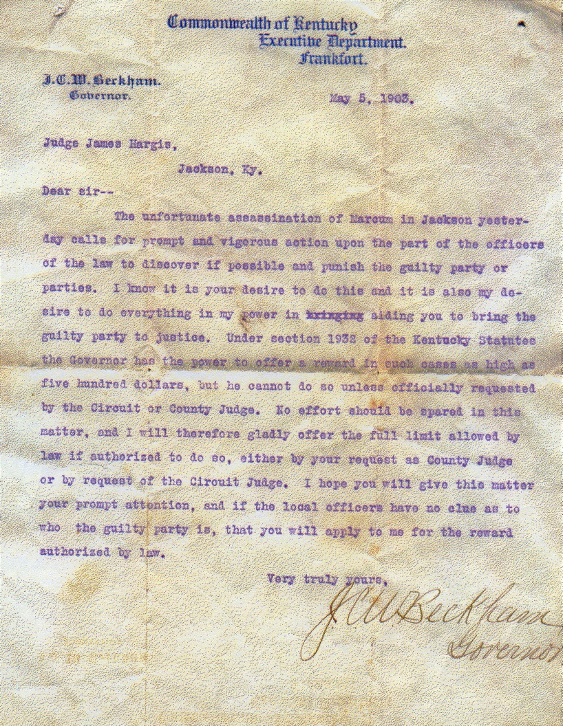 Judge James Hargis Jackson, Kentucky Dear Sir-- The unfortunate assassination of Marcum in Jackson yesterday calls for prompt and vigorous action upon the part of the officers of the law to discover if possible and punish the guilty party or parties. I know it is your desire to do this and it is my desire to do everything in my power in aiding you to bring the guilty party to justice. Under Section 1932 of the Kentucky Statutes, the Governor has the power to offer a reward in such cases as high as five hundred dollars, but he cannot do so unless officially requested by the Circuit or County Judge. No effort should be spared in this matter, and I will therefore gladly offer the full limit allowed by law if authorized to do so, either by your request as County Judge or by the request of the Circuit Judge. I hope you will give this matter your prompt attention, and if the local officers have no clue as to who the guilty party is, that you will apply to me for the reward authorized by the law. Very truly yours, /s/ J.C.W. Beckham Governor