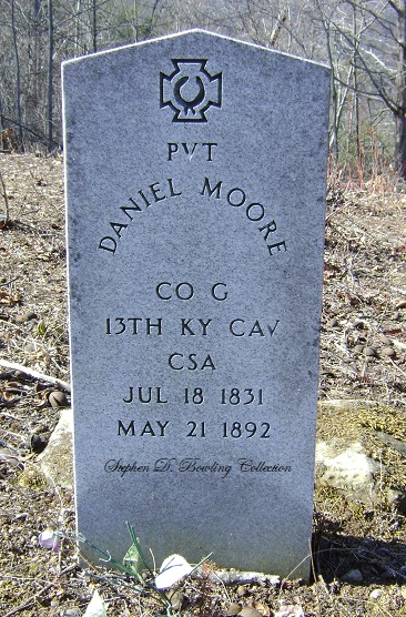 On Friday, October 8, 1999, a small group of Breathitt County historians placed a new tombstone on the grave of Daniel Moore at the Moore Cemetery at Altro after several years of research and genealogical work. Carlos Brock and Charles Riley of the Breathitt County Historical Society placed a new granite military marker in honor of his service in the Confederate Army as a Private in the 13th Kentucky Cavalry under the command of Colonel Benjamin E. Caudill of Letcher County, Kentucky.