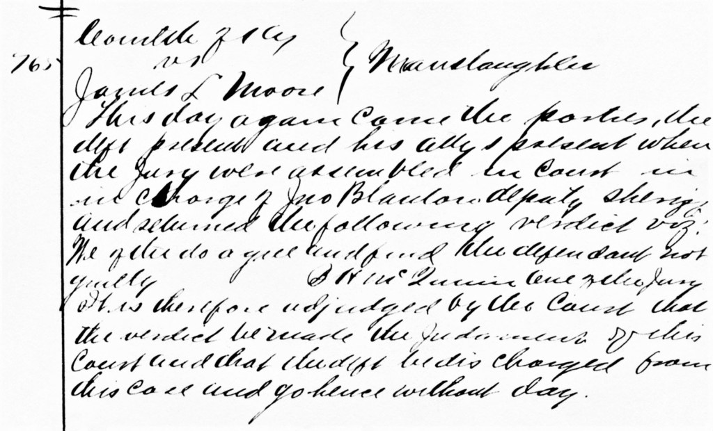 The following day, Thursday, June 19, 1893, the Jury deliberated for less than an hour and returned a verdict in court. B. H. McQuinn, the foreman of the Jury, stood and read the verdict: “We all agree and find the defendant not guilty.” James Lewis Moore and all witnesses were released from their bonds to the court and returned home.