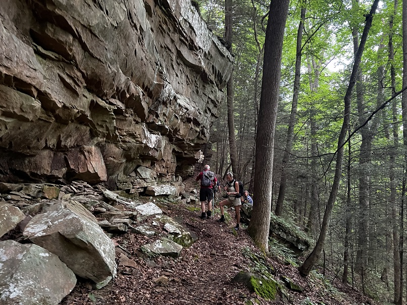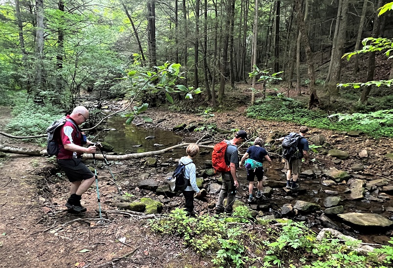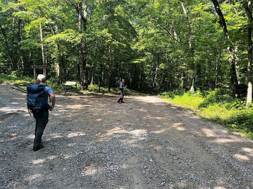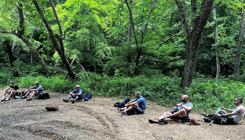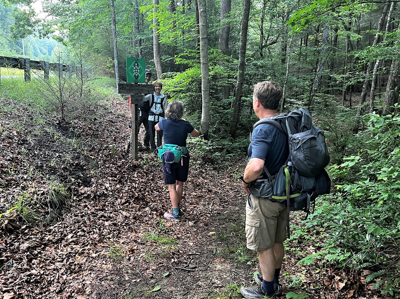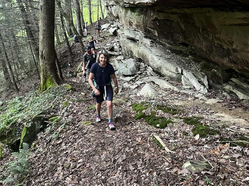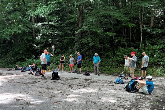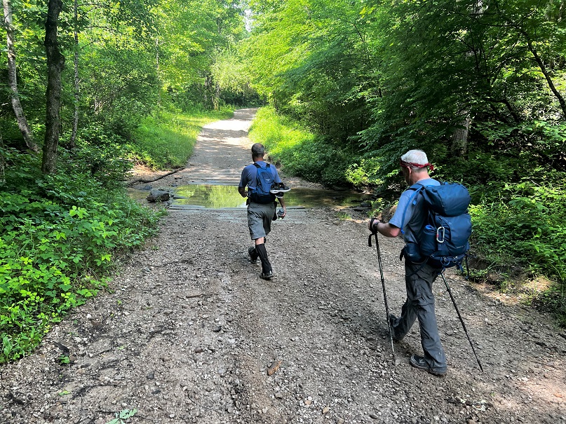 Overgrowth and stolen markers sent many hikers to the downstream ford on Horse Lick Creek. The stream was low, and the crossing was cool and pleasant. The trail was well marked otherwise and hikers started to arrive at the shuttle pickup point shortly after noon. Steve Barbour arrived exactly on time and shuttled hikers to the Livingston Schoolhouse, where Saturday night’s camp was established in the air-conditioned gym.