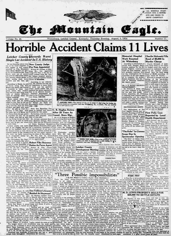 What started as a fun car ride on Highway 119 over Pine Mountain on July 31, 1954, ended a little after noon in the worst single-car accident ever recorded in American history, according to National Safety Council records. When the flames died down, the two-door automobile held the bodies of eleven people- three adults, a teenager, and seven small children.