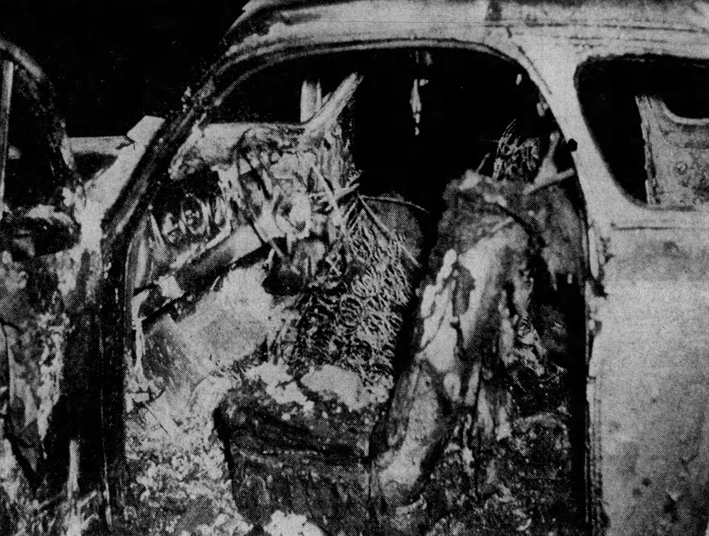The gasoline tank of the car burst into flames. Mrs. Butler Wright, who lived near the crash site, said she heard the crash and then the screams. “Then the tank exploded and I didn’t hear the screams anymore,” she said with tears. She told officials that the screams from inside the car stopped “less than two minutes” after the fire started.