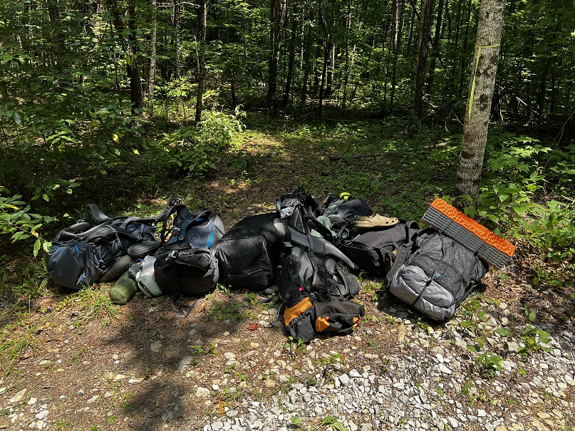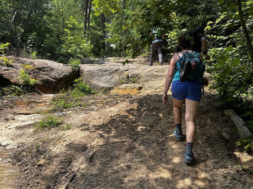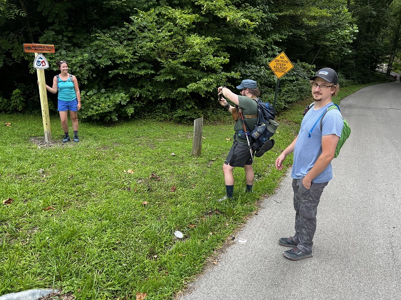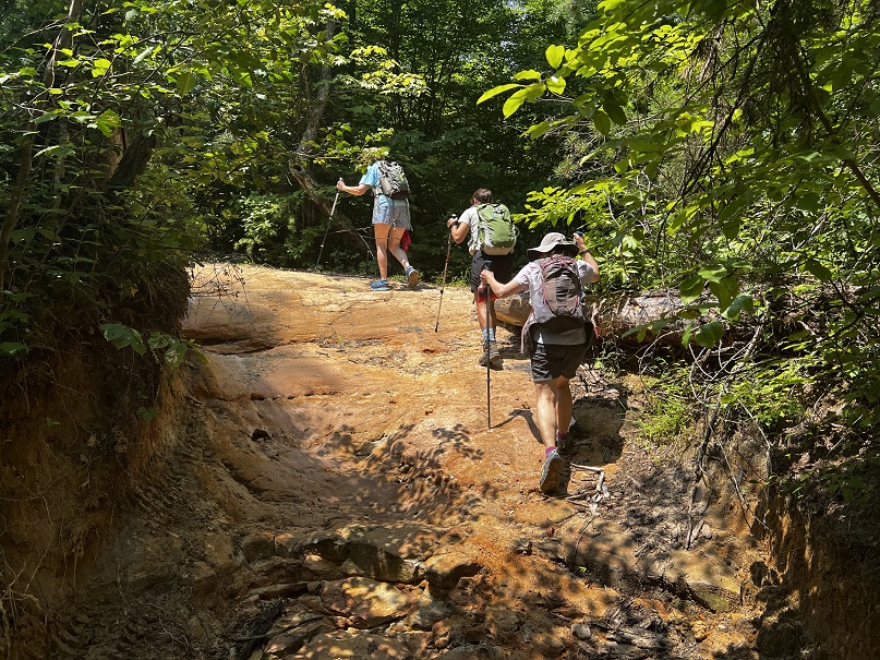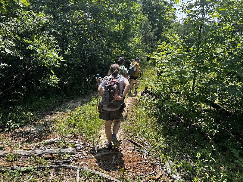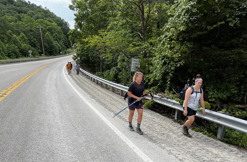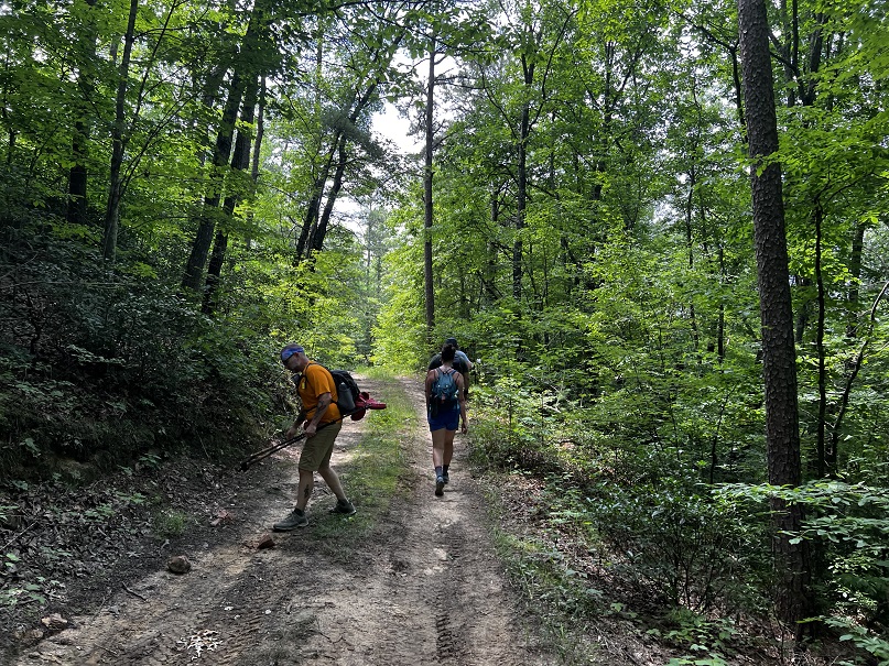 Hikers participating in the 2022 Sheltowee Trace Challenge cut their way through 4000% humidity and temperature in the mid to upper nineties. The hike started with a downhill on a roadway, followed some blacktop, and eventually returned to the woods.