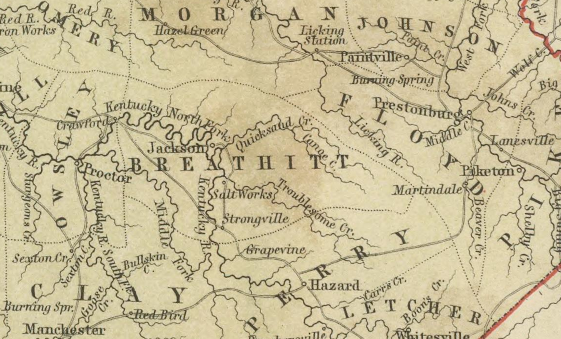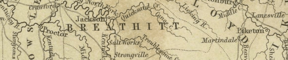 “One of the more important salt works in eastern Kentucky was located on Troublesome Creek about one and one-half miles upstream from the mouth of Lost Creek. In 1838, a report to the Kentucky House of Representatives stated that these works had a daily capacity of ten bushels. This is undoubtedly the Breathitt Salt Works referred to in the 1840 U. S. Census as having a product of seventy bushels and with three employees.