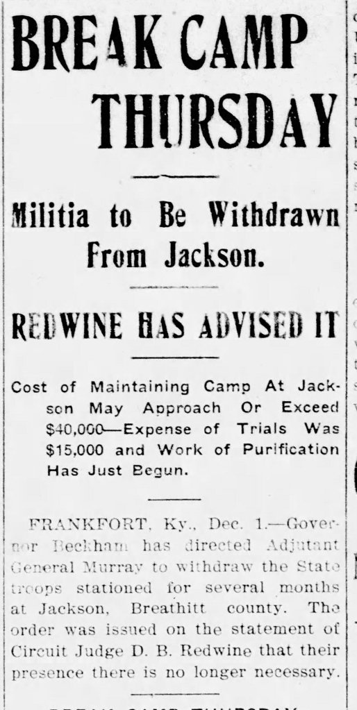 The last of the State Militia loaded a train headed for Lexington at six o’clock on December 4, 1903, having been in Jackson for almost seven months. With the withdrawal of troops, many concerned taxpayers in the state began to question the total cost of maintaining order in the mountains of Breathitt County.