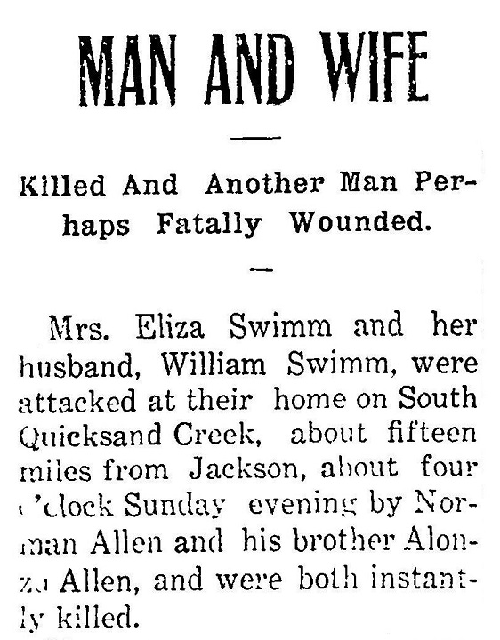 Mr. Eliza Swimm and her husband, William Swimm, were attacked at their home on South Quicksand Creek, about fifteen miles from Jackson, at about four o’clock Sunday evening by Norman Allen and his brother Alonzo Allen, and were both instantly killed.