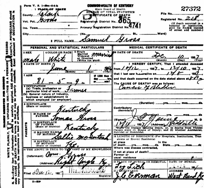 Died– 1927, December 10 at Log Lick in Clark County, Kentucky of bladder cancer.