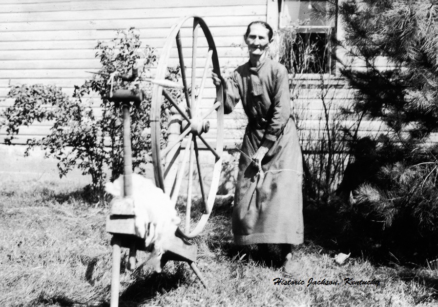 All of the farmers of the country cultivated every year a patch of one or two acres of flax, and many of them small patches of cotton. Most of them owned flocks of sheep, the wool from which was manufactured into blankets, coverlets, flannel, jeans, and linsey and used to make clothing for the family, including socks and stockings. The machinery necessary to manufacture the flax, cotton, and wool consisted of a flax break, hackle with iron or steel teeth, a little spinning wheel with flyers propelled by a woman’s foot for flax and cotton, and a big wheel for spinning rolls, also wool and cotton handloom and warping bars. Every prominent farmer was supplied with these necessary implements of industry which enabled the ladies of pioneer days in Kentucky to manufacture clothing for their families.”