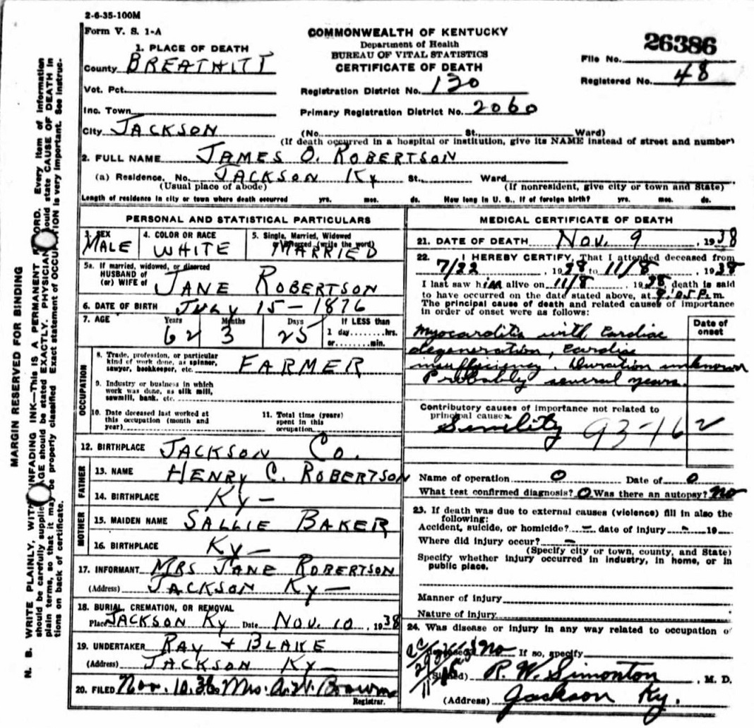 Died– on November 9, 1938, of myocarditis at Jackson, Breathitt County, Kentucky