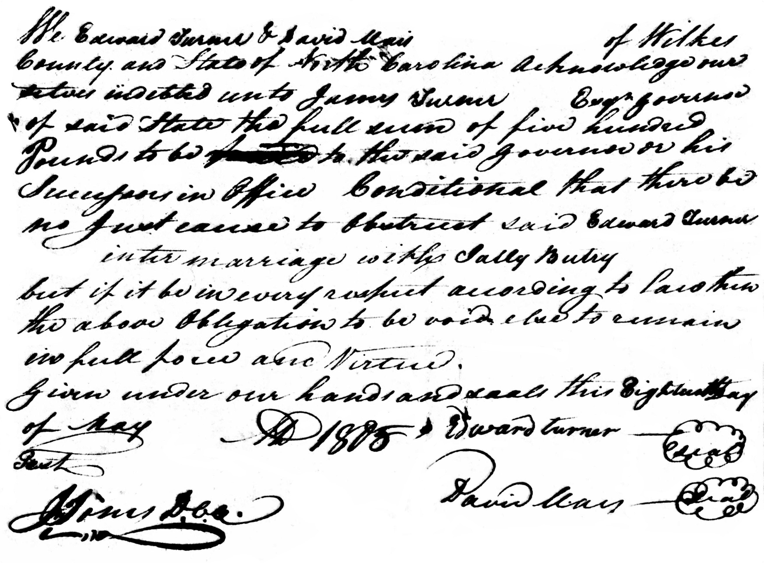 Married– bond issued on May 18, 1805, to Sarah “Sally” Buttrey (1786 – after 1850) in Wilkes County, North Carolina, with David Mais (Mays) surety. She was the daughter of Timothy and Mary (Turner) Buttrey.