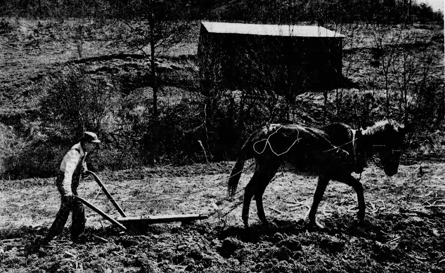 Walking slowly behind his mules, Turner was turning over his garden with an old red mule that was “Swaybacked, skinny around the ribs and neck, and a bit shaggy and worn looking.” He explained that Dorie, his mule, was once “a beauty” and a “real hard worker” before noting that time has taken its toll on both of them. Turner, age 55, worked Dorie down the long row and turned her around. “Git Up, Dorie,” he said as he guided the bull-tongued plow back up the row leaving a wide furrow behind him. He stopped in the shad eat the end of the row to talk to Peterson. Peterson described Turner as “lean, ramrod straight and dignified looking in his bib overalls.”