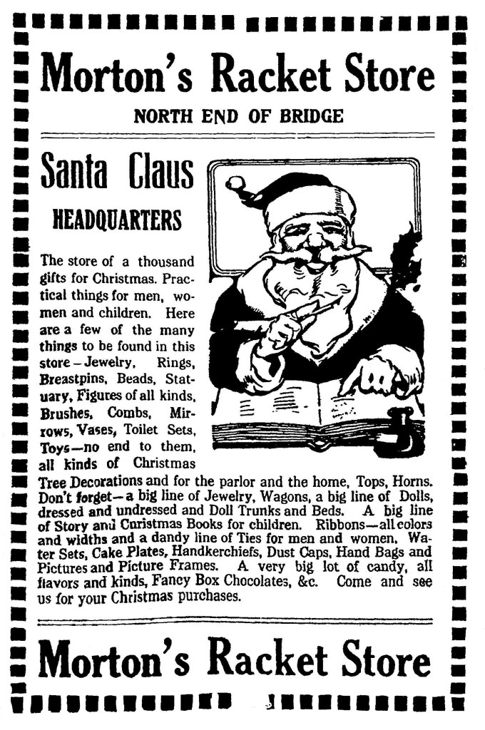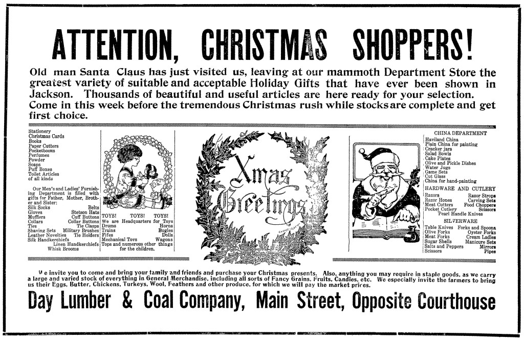 With less than ten days left to get ready for Christmas, many shoppers are scrambling to find last-second gifts. The tradition of rushing to finish Christmas lists has been around as long as present giving has been a holiday tradition. The local merchants and The Jackson Times took advantage of those who waited until the last minute. The pages of the paper are filled with advertisements for a variety of products and services since the paper started in 1910.