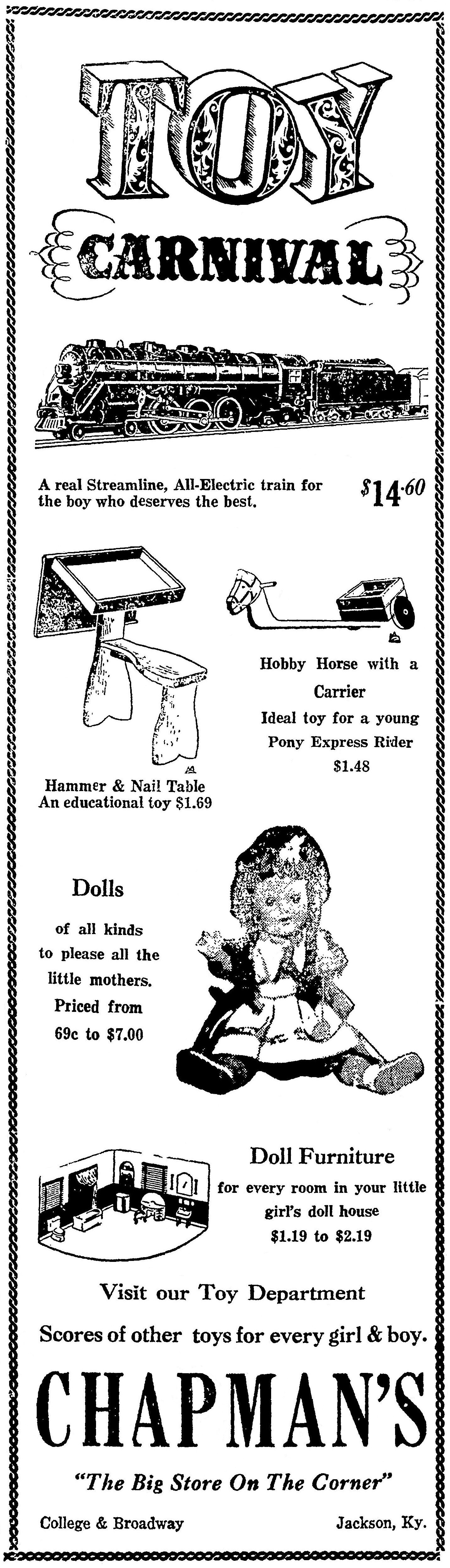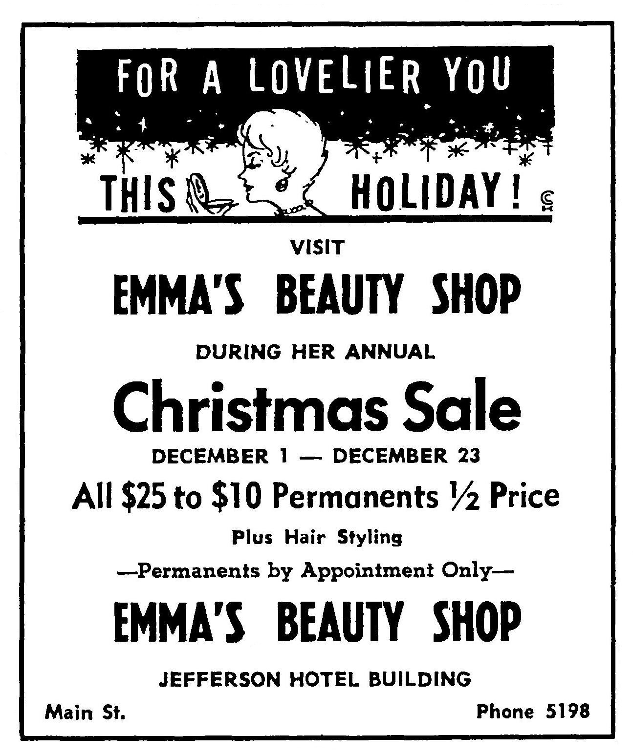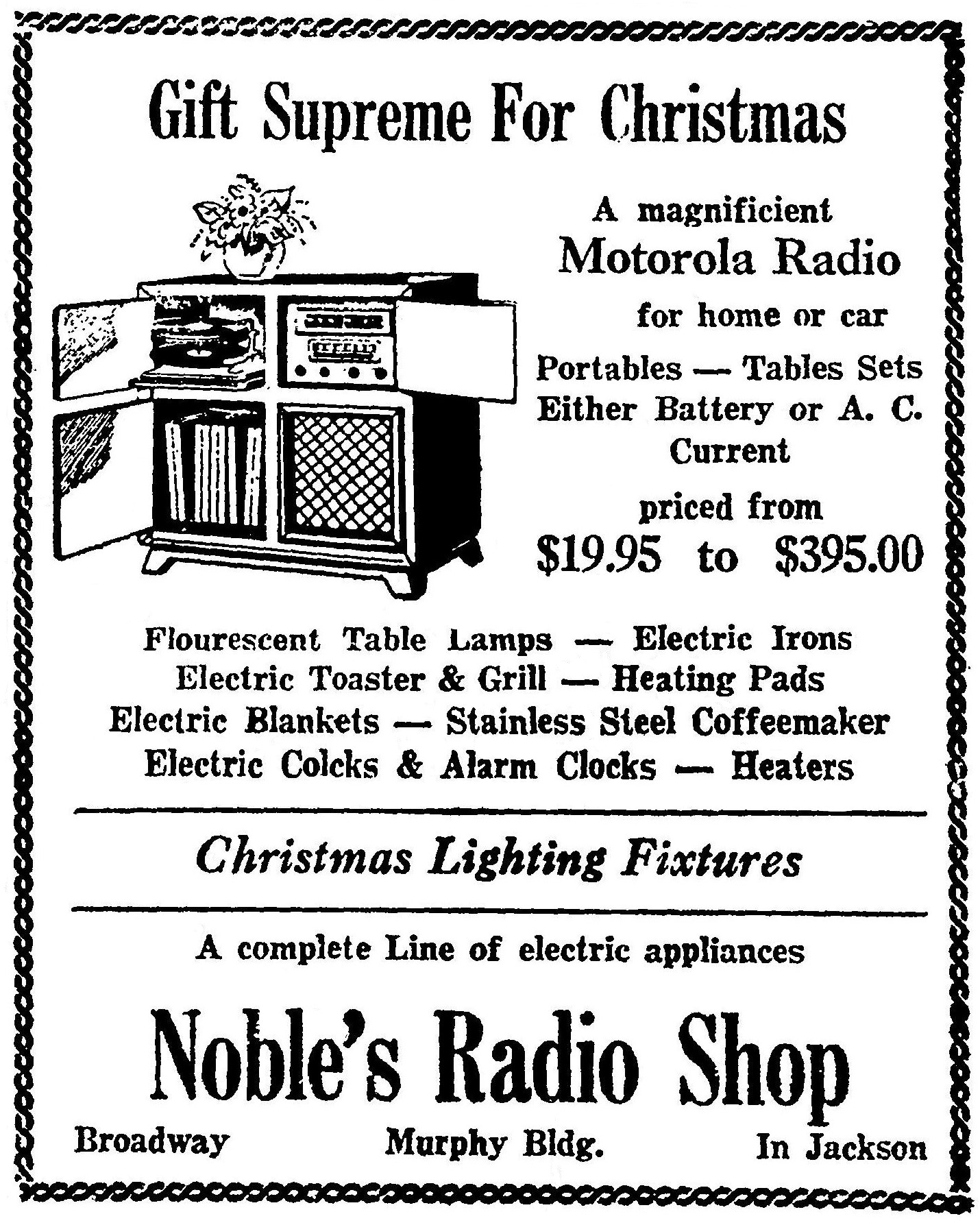 We do not know how many children sat and looked at the ads in the paper before making the wish list or asking Santa for a present. The Jackson Council of Commerce certainly hoped that more items were purchased from their stores than were ordered from retail catalogs. How effective these ads were at drawing in customers cannot be determined, but who would not want a new pocket knife, a new radio, or a half-priced permanent to look even lovelier this Christmas Season.