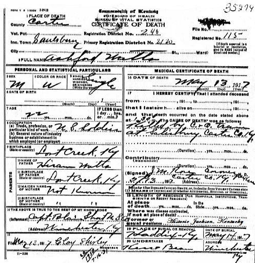 According to the official report, Watts’ skull was crushed, and his body was “otherwise mutilated.” Ashford Watts died instantly and became the first Breathitt County casualty of World War I. There would be others to follow.