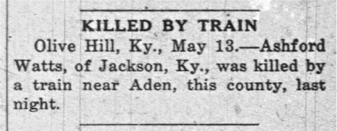 While walking his guard duty post guarding a train tunnel on the night of May 13, 1917, he walked to the end of a tunnel to get a drink of water not long after his shift started. As he approached the lower end of the cut of the tunnel near the community of Aden in Carter County, a C & O Fast Passenger Train exited while coasting downhill at a high rate of speed and struck Private Watts just after midnight. He suffered a severe blow to the head while trying to get out of the way of the quietly moving train. His clothes snagged on the train which dragged his body for some distance.