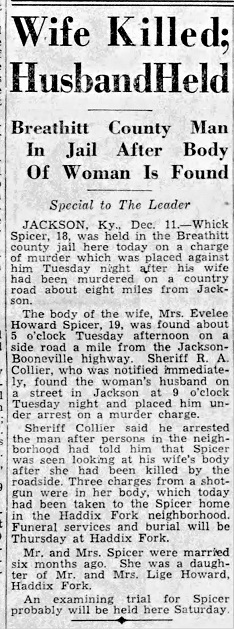 Whick Spicer’s examining trial was held on Saturday, December 21, 1935, in the Breathitt County Court. Witnesses near the scene, including Evalee Spicer’s father, Elijah Howard, testified that they saw Whick in the area carrying a shotgun just before and after the shooting. Officers presented into evidence a 12-gauge shotgun that they found at the home of Spicer’s cousin, Daniel Spicer. According to testimony, Whick Spicer “left it there for safe keeping” with several shells that matched those found on the roadway near the body. Enough evidence was presented the Judge ordered Spicer held without bond until his case could be presented to the next Breathitt County Grand Jury and his trial date was set in 1936.