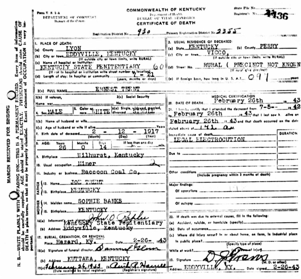 Having exhausted his appeals, Ernest Trent was one of four inmates who were executed by the state at Eddyville State Penitentiary on February 27, 1943. He was 26. At his last request, the Warden allowed Trent to play “Lord, I’m Coming Home To You” on the harmonica after the was seated in the electric chair. He is the only known Breathitt Countian to be executed by the state after hanging was abolished as a legal method of death in 1911. His body was returned to Breathitt County and buried in the family cemetery on Johnson Fork of Frozen Creek.