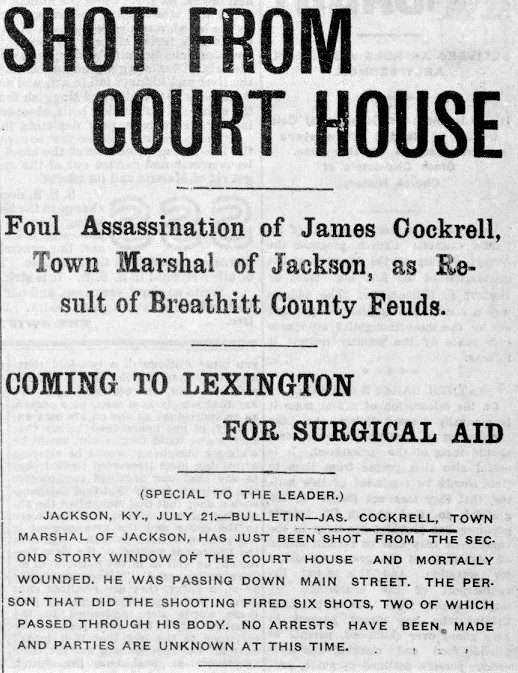July 22, 1902 – In the history of the United States, one feud claimed more lives than any other. Surprisingly enough, that played out its many twists and turns on the streets of Jackson and in the hills of Breathitt County. By some estimates, the Callahan/Cockrell/Little/Hargis/Marcum/Jett/etc. feud killed as many as 320 people. Many of these men and women have all but been forgotten in the annals of our history. One of these men whose name has survived almost as a footnote is Town Marshal James Cockrell.