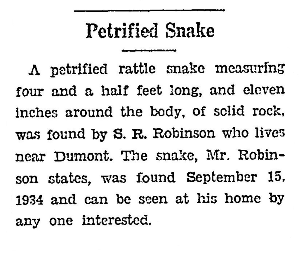 Through the years, the newspapers in Breathitt County and around the country loved to print strange and unusual stories regardless of the verification of facts. Some of the stories were so outlandish that they could not be true, but others have since been verified. On Thursday, October 15, 1936, The Jackson Times ran a small, one-paragraph article on page 8 with the headline “Petrified Snake.”