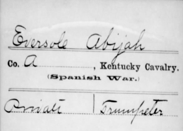 When the U.S.S. Maine exploded in Havana Harbor on February 15, 1898, Bige Eversole volunteered for the United States Army to go and fight the Spanish in Cuba and at various points worldwide. He enlisted in Troop A of the First Kentucky Cavalry as a Bugler. Military efforts by the United States and its allies around the world were successful, and the war effort progressed much faster than most expected.