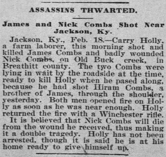 Early on the morning of February 18, 1896, James and Nick Combs found their spot and awaited the opportunity to waylay Holly as he walked to the farm of Ike Gilbert, where he worked as a hired farm hand. Just after daybreak, they spotted Holly walking down the road. When Holly came into range, the Combses opened fire, one with a rifle and a shotgun. None of the shots aimed at Holly found their mark as Holly dove for cover at the side of the road. From a secure spot, Holly returned fire with his Winchester rifle.