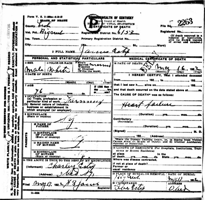 Died – 1922, May 16, at Big Creek in Leslie County, Kentucky, of heart failure