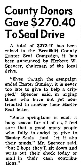 I am unaware of any local campaign that runs today, but Easter Seals was a significant part of the charitable giving each year for local residents. By 1956, Breathitt County had 12 children who were being treated at the Cardinal Hill Hospital in Lexington as the result of the campaign.