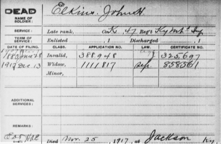 Widow’s Death– July 27, 1933, at the home of her son, Elbert Elkins, at Jeff, Perry County, Kentucky (Kentucky Death Certificate #17438)