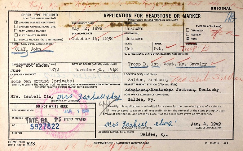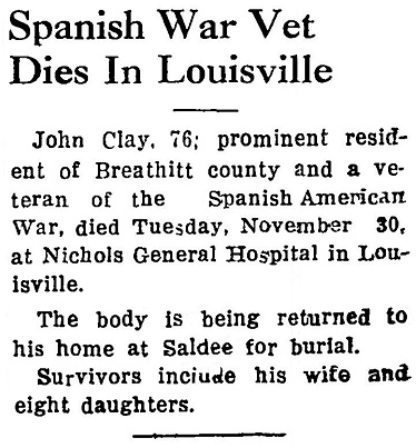 Buried in the Clay Cemetery at Copeland, Breathitt County, Kentucky