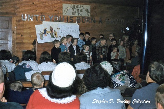 The Little Jerusalem Old Regular Baptist Church once shared a building with the Big Branch School. The building was the scene of many Sunday Schools and Christmas programs like this one sponsored by missionaries from the Rehoboth Church on South Fork.