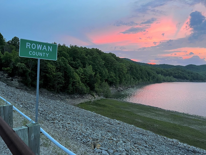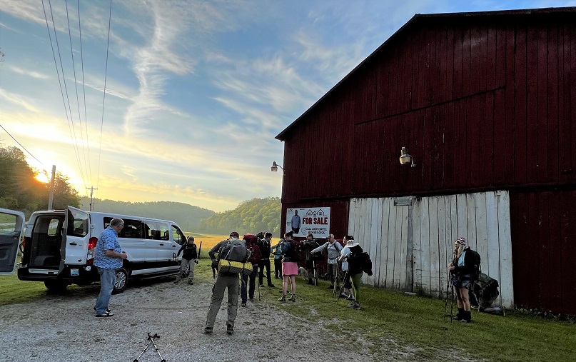 Sunday dawned with a beautiful sunrise as hikers got up and going early to attempt to outrun the threat of rain and the possibility of strong storms. Cross the dam and up the hill to the ridge top. On the way over to Amburgey Rock, the trail is tough but nice. There are several more downed trees in this section, so be prepared to climb over these large oaks. The trail follows an old forest service road past several bike trails and around the side of Limbstone Knob before heading down into Mill Creek for a long asphalt walk to Clearfield and Morehead. Lightening, ominous dark clouds, and thunder helped quicken the pace of many Heron hikers. Ultimately, most proved unable to outrun the deluge of rain and wind that the late morning/early afternoon storms brought.