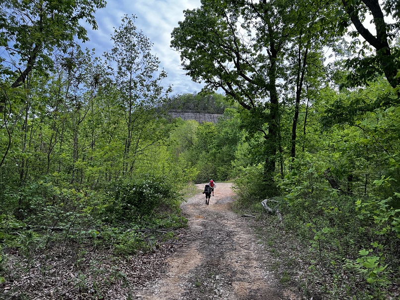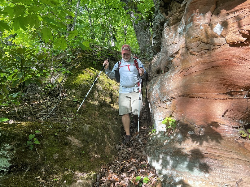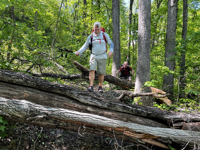 The May hike was a long (35 miles) trek through some difficult terrain. Don’t be worried- you can handle it. Be aware and be prepared. The hike begins with an uphill climb from the Red Barn to the ridge. With several small ups and downs, you make your way over the hill to Richardson Road. Then back up the hill and basically undulating ridge walk to Furnace Arch and then more of the same until the trail drops over Mount Misery and down to Clear Creek. There is no available water in this 8.5-mile stretch. Be sure to camel up with Steve or from Clear Creek as the next section is dry too. There are a few downed trees in this first section but nothing major.