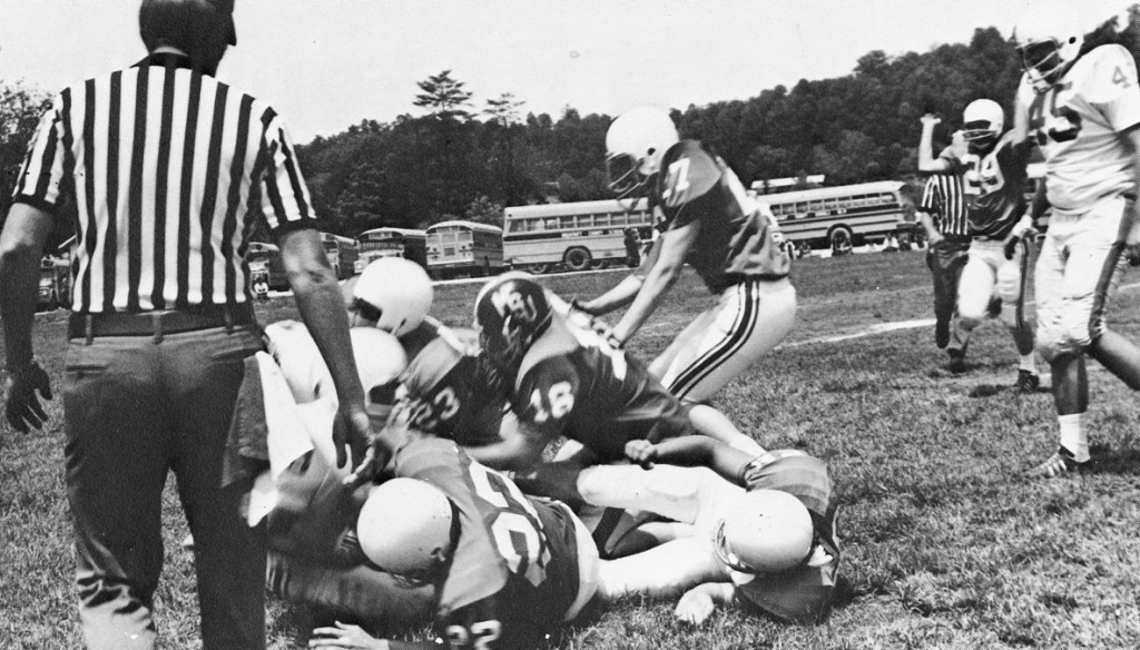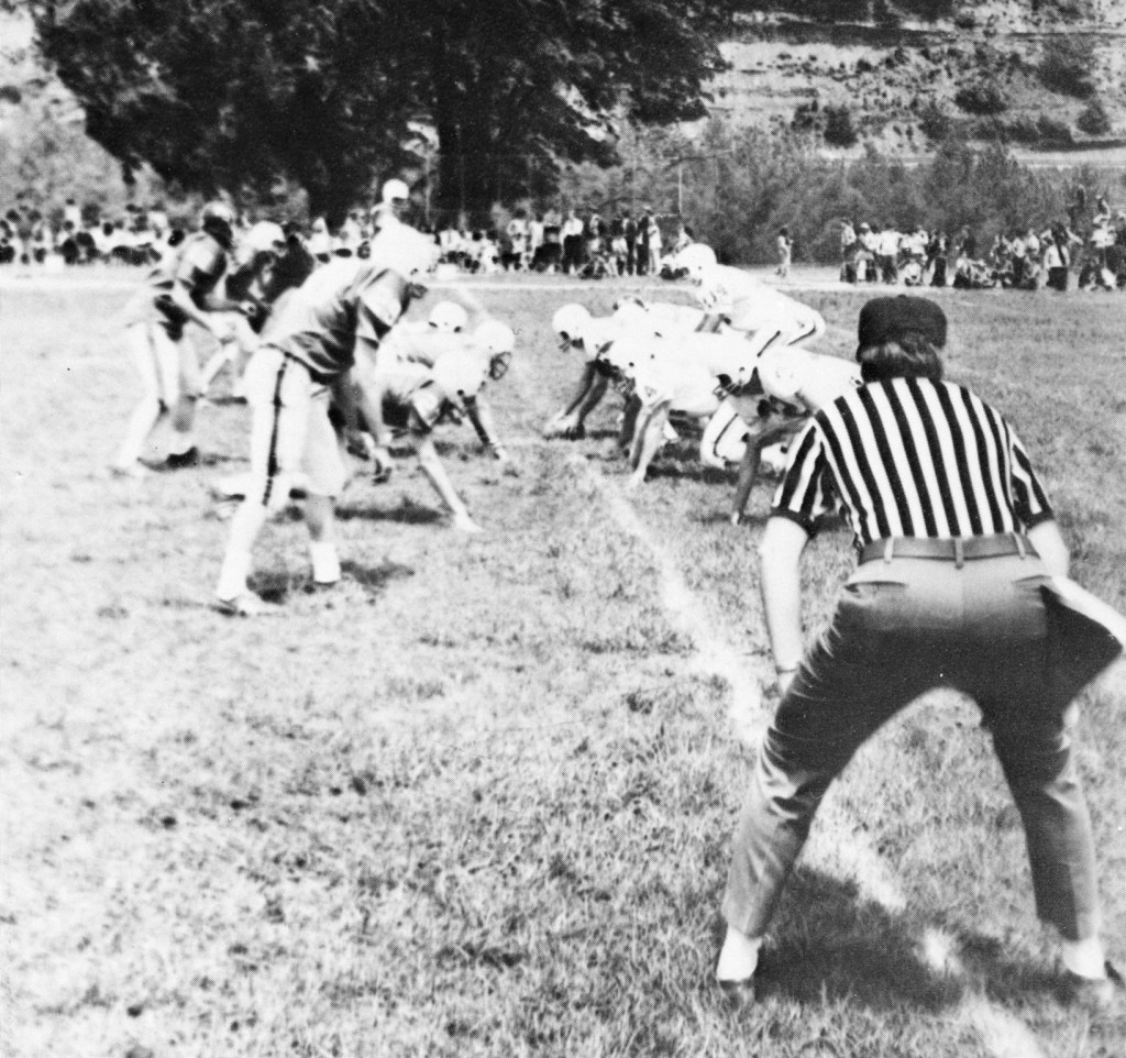 The first game was a defensive struggle with no kick-offs or extra point kicks during the scrimmage. The first points scored in Breathitt High School football history came from a safety in the first quarter. The White Team stopped a Blue Team drive and forced a punt on fourth down. Blue’s center Greg Elkins hiked the ball well over the head of the punter, Mike Riley. Riley scrambled to recover the ball but was swarmed in the endzone by several White Team players. Tom Strong was credited with the tackle and the first points in Breathitt football history.